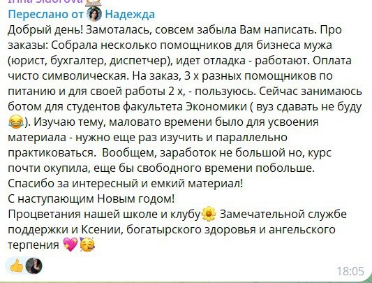 Результаты ее работы вдохновляют: уже через короткое время помощники начали приносить ощутимые преимущества. Инвестиции в обучение не только оправдали себя, но и позволили начать экономить время и нервы, что особенно ценно в бизнесе.