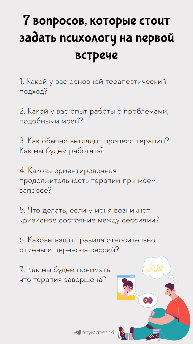 Это встреча в духе взаимного изучения: вы можете изучить подход психолога, а он — вас. Чтобы максимально эффективно использовать это время, важно заранее подготовить несколько ключевых вопросов.