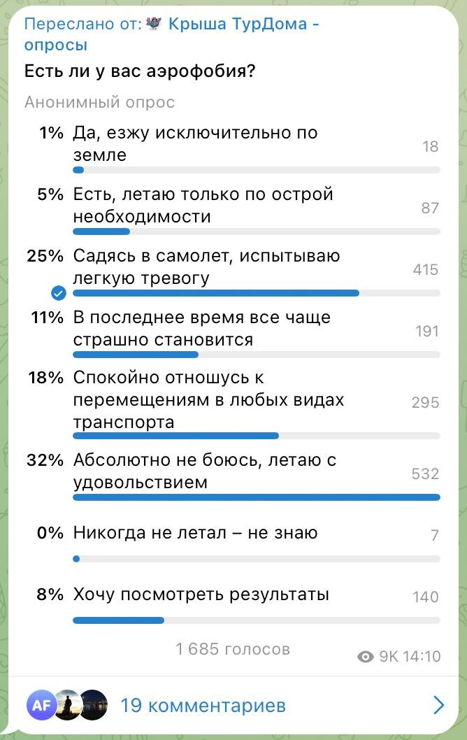 Несмотря на страхи, подавляющее большинство участников опроса предпочитают не отказываться от путешествий. В нашем туристическом сообществе все еще преобладают те, кто верит в комфорт и безопасность полетов. Они настойчиво утверждают, что радость от новых впечатлений перевешивает любые опасения.