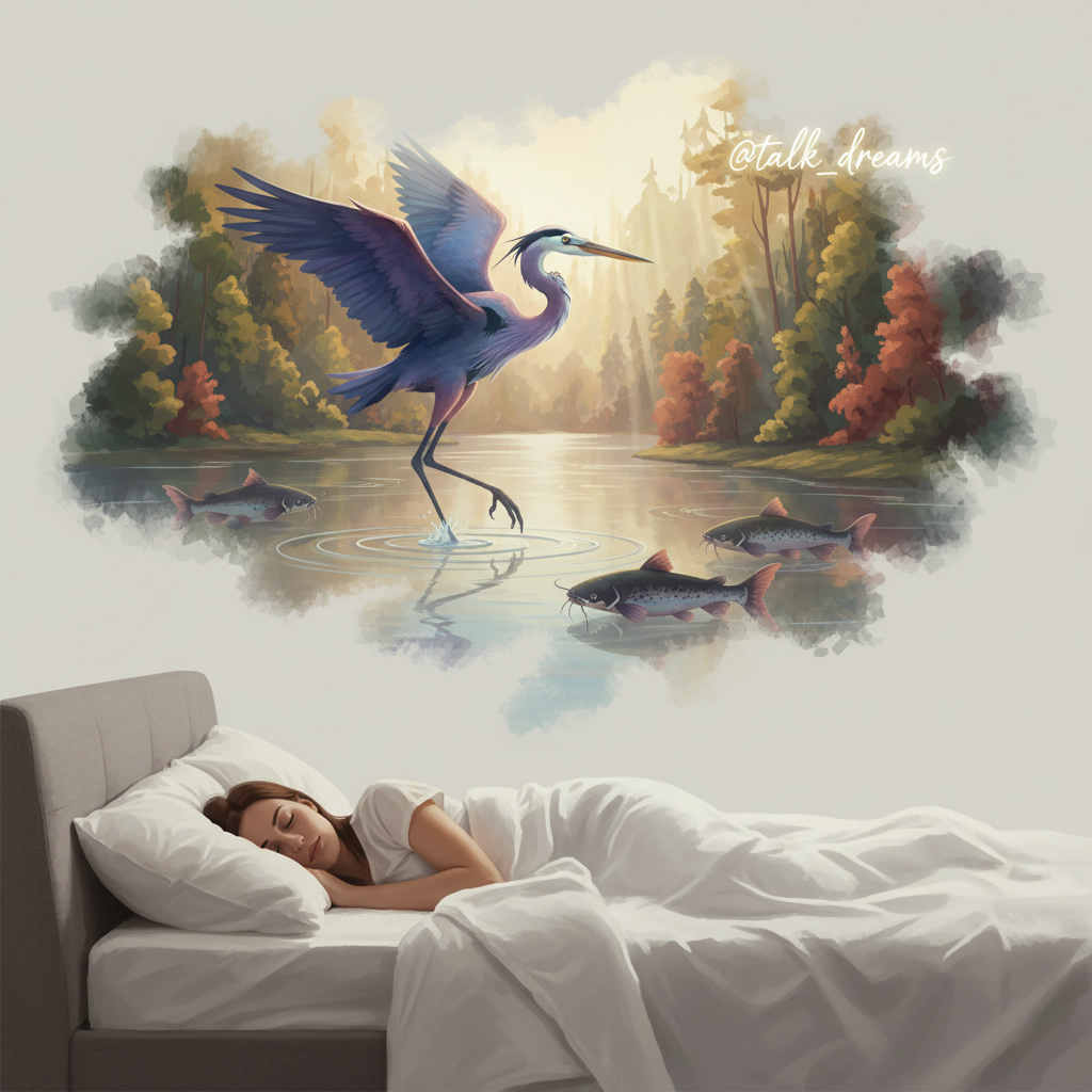 Во сне она представила себя огромной птицей, парящей над гладью озера. Легкий ветерок касался ее перьев, а лапы нежно соприкасались с водой, даря ощущение спокойствия. Вокруг раскинулся густой лес, а над головой светило яркое солнце. В воде играли крупные рыбы, похожие на сомов, которые, не спеша, шевелили хвостами.