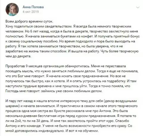 Анна поняла, что её истинное призвание должно быть чем-то большим, чем простая подработка. Она обратилась к Богу за поддержкой и ощутила, как Он направляет её к тому, что приносит настоящую радость. После нескольких лет поисков Анна нашла себя в декоре на воздушных шариках и вскоре познакомилась с проектом «Духовная Экономика», который стал важной вехой её духовной трансформации.